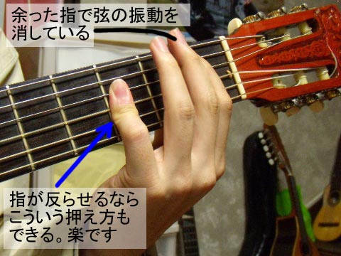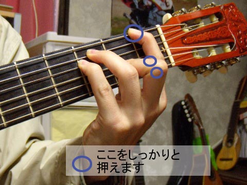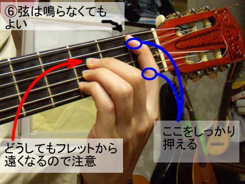 しかし、恐れることはありません。ここでは、かなりいい加減な押さえ方のコツをご紹介しましょう。 まず、Fのコードダイアグラムを確認しておきます。 ①●++ ②●++ ③+●+ ④++● ⑤++● ⑥●++ ここで、全弦を押さえる人差し指は、本当に全部の弦を押さえようとするのではなく、まずは⑥弦だけを押さえてみましょう。 そして、薬指、小指、中指でそれぞれ⑤④③弦を押えます。これだけでも鳴らせばそれなりに音は出ます。 そして、①②弦は、人差指の付け根あたりに位置しますが、その人差指の付け根でこの2本だけを押さえるようにします。 人差し指を、心持ち丸くして(ちょうど真ん中の弦あたりはちゃんと押さえられていない)両端の弦だけを押さえることに専念します。 人差し指が①②弦に当たる場所は結構弾力性があるので、人差指は要するに①②⑥弦さえしっかり押さえ、あとの弦はあとの指に任せていれば、Fは十分鳴ります。 これで、全弦を押さえるよりも少ない力で弦を押さえることができます。 B♭はさらに難しいです。考え方は同じですがむしろ中指がしっかり第3フレットを押さえることができるように気を遣うことが大事です。 なお、B♭のときは、無理に第⑥弦を鳴らそうとせず、なれたら人差指の先に⑥弦が触れる(つまり弦が振動せず鳴らない)ように押えます。⑥弦は鳴りませんが弦を弾いた直後はFの音程で瞬間音が鳴りますがちゃんとハモるので全く気になりません。 むしろ⑥弦を無理に抑えようとして、主音のB♭音(⑤弦)が鳴らなくなることを避けたいです。 ちなみに私は、小指がよく反るので、②③④弦を小指で押さえています。 もし小指または薬指が反るならこの押さえ方がものすごく役に立ちます。 これでFもB♭も怖くない!皆さんよかったらお試しください。 PR